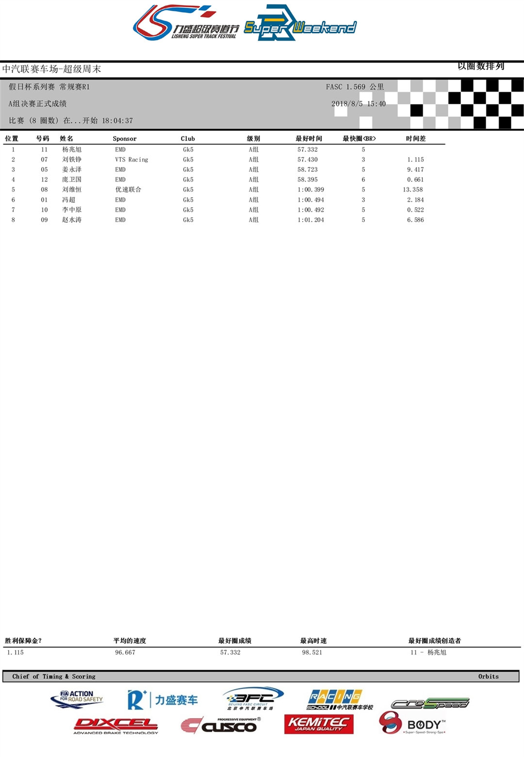A组(1800cc以下排量),10台本田GK5。发车后EMD车队杨兆旭一路领跑,最终摘得桂冠;VTS Racing车队的刘铁铮紧随其后获得第二名;第三名由EMD车队的姜永泽获得。